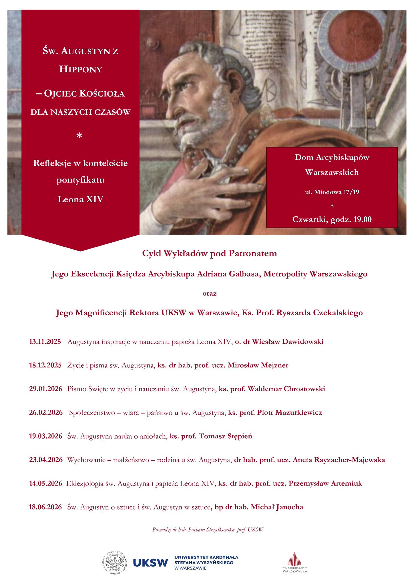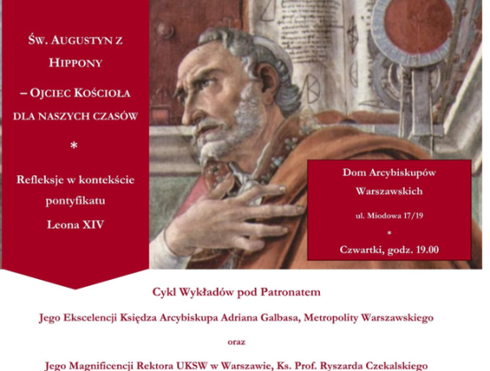 Serdecznie zapraszamy na cykl wykładów pod Patronatem Jego Ekscelencji Księdza Arcybiskupa Adriana Galbasa, Metropolity Warszawskiego oraz Jego Magnificencji Rektora UKSW w Warszawie, ks. prof. dra hab. Ryszarda Czekalskiego „ŚW. AUGUSTYN Z HIPPONY – OJCIEC KOŚCIOŁA DLA NASZYCH CZASÓW. REFLEKSJE W KONTEKŚCIE PONTYFIKATU LEONA XIV”