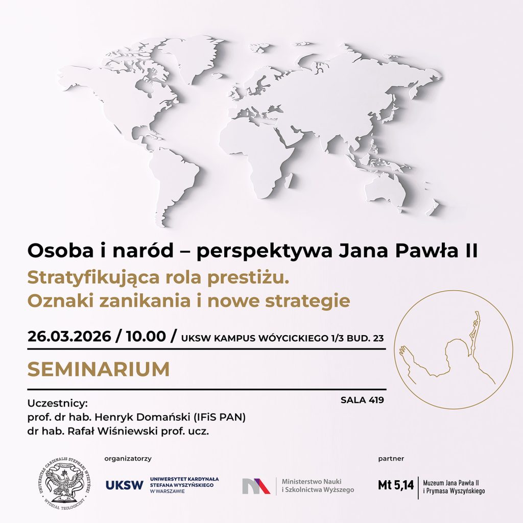 W socjologii prestiż jest elementem hierarchii społecznej, powiązanym z oceną jednostek, grup i instytucji, i stanowi ważny czynnik organizujący relacje społeczne. Mimo, że kryteria prestiżu się zmieniają w kierunku mediów i celebrytów, on sam pozostaje trwałym czynnikiem organizującym dystanse społeczne. Tymczasem w swoim nauczaniu Jan Paweł II wskazuje, że naród nie musi być konstrukcją hierarchiczną, lecz wspólnotą naturalną, powstałą dzięki rodzinie, kulturze i historii. Jak pogodzić nauczanie papieża Polaka na temat wspólnego dziedzictwa narodowego z obecnym w społeczeństwie mechanizmem prestiżu, o tym porozmawiamy na kolejnym z cyklu seminariów Osoba i naród – perspektywa Jana Pawła II – czwartek 26 marca. Muzeum Jana Pawła II i Prymasa Wyszyńskiego jest partnerem projektu naukowego realizowanego na Uniwersytecie Kardynała Stefana Wyszyńskiego w Warszawie.