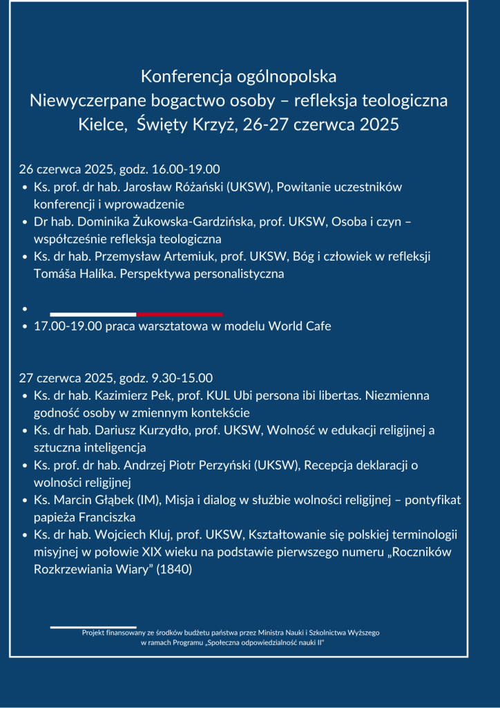 W dniach 26-27 czerwca 2025 odbyła się konferencja „Niewyczerpane bogactwo osoby – refleksja teologiczna”. Program wydarzenia do pobrania.